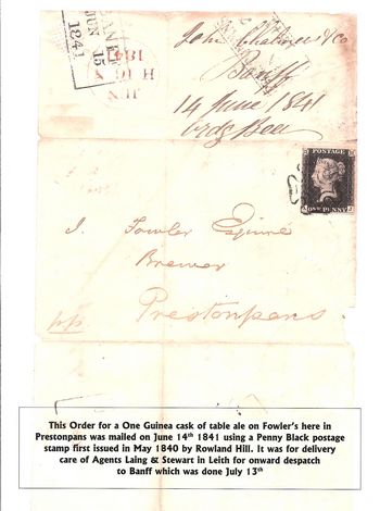 An extraordinary antiquity has just come to light on eBay. It is a letter written on June 14th 1841 and postmaked both 15th and 16th from Banff ordering a cask of Fowler's Table Beer value one guinea .... with pleasingly the promise to return the cask. It was "sent and advise" by Fowler's on July 13th.