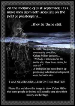 Most sharers at this NewsNet will know there's a stramash afoot about an off-hand remark by Cllr. Calum Miller at Prestonpans Community Council last week. He unwisely, he suggests unguardedly, opined that nobody wants the battle site. Truth is they do, and they're not simply 'battle huggers' or just well contented re-enactors! Educationalists, archaeologists and cultural anthropologists as well as a multitude of very regular Panners really do. And so do folk across the globe. They're all signing up to the Petition the Battle Trust launched 3 days ago.