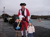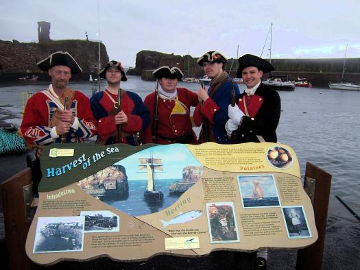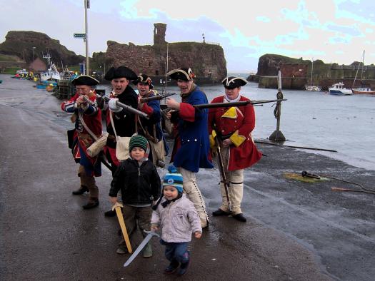 Alan Breck Prestonpans Volunteers were in uniform as redcoat re-enactors in Dunbar for the first time since 1745 [probably!] on a blustery, damp day. As the pictures show below they braved the elements and alerted the citizens of Dunbar to the impending battle at Prestonpans - taking place Saturday and Sunday September 25th & 26th at 3 pm.