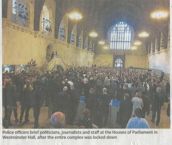 The Metropolitan Police and Parliament's own Officers resolved to keep the Hall closed until Friday and then re-closed over the weekend This had the unfortunate consequence that the planned Formal Opening in the Presence of the invited High Commissioners and Ambassadors on Thursday night, March 23rd, had perforce to be cancelled.