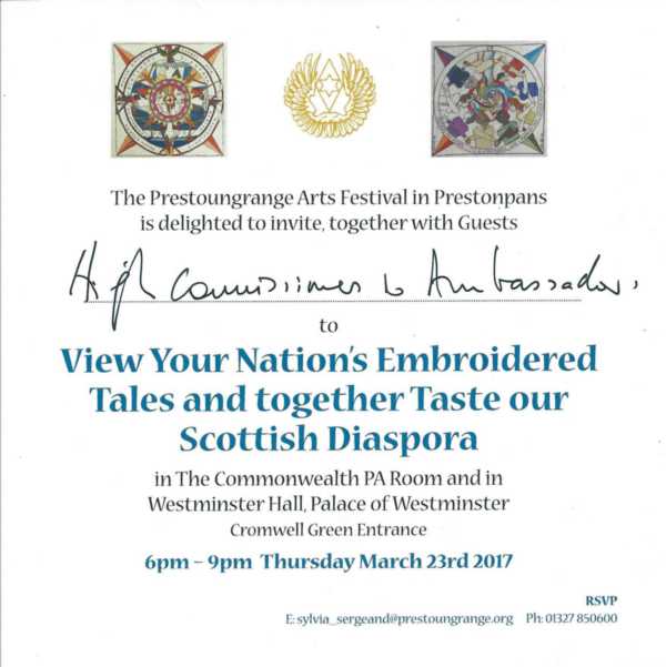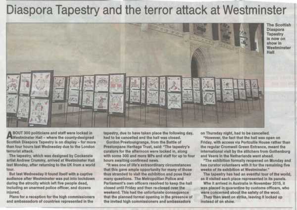 Little did we all realise that just two days later the tragic incidents would occur immediately outside the Hall, firstly on Westminster Bridge and then at the gated access to New Palace Yard. The tapestry's curators for the afternoon were locked in along with some 300 and more MPs and staffs for up to 4 hours awaiting confirmed news. It was one of life's extraordinary circumstances that this gave ample opportunity for many of those thus stranded to visit the exhibition and pose their many questions. Jenny Bruce who had led the Global Tour had left just earlier and safely with visiting Icelandic embroiderer Bryndis, from the Global Tour's last port of call in February.