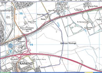 .... but fortunately we have a long serving member of ScotWays, Andrew Ralton, author of Prestoungrange University Press Historical Study # 19: The Roads that led past Prestoungrange and lately ELC/ EU North Sea Walks Supremo, as our adviser. The overlaid modern map below is his "current best educated guess based on looking at old maps [such as Mather's Tranent Runrig System 1770 and William Hunter's Land Plans 1832], and features in Cadell's book which can still be identified today". The challenge arises since the whole area has been open cast mined and the Riggonhead Farm no longer exists. Indeed the area is now known as Blindwells. Perhaps an even greater challenge is the fact that the A1 and the railway both cross the ancient route so absailing may be required this time around.