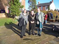 [The Mayor of Derby (centre) is pictured with the Chairman of South Derbyshire Council, Councillor Mike Lauro, and the Baron of Prestoungrange for the Trustees who watched all these events unfold. They later laid wreaths at the cairn built by the Charles Edward Stuart Society to commemorate the action on the 250th Anniversary in 1995.]