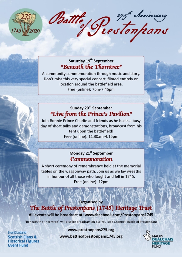 • Live from the Prince’s Pavilion at Meadowmill. (20th September, 11.30am - 4.15pm): Join Bonnie Prince Charlie and friends for a virtual festival featuring a series of 15-minute video presentations hosted live from Prestonpans battlefield. Viewers will learn about the tactics of the battle, learn about the clans and regiments that fought there, and how the rival soldiers dressed. There’ll also be an 18th century cooking demonstration, and the Prince will answer questions submitted by local primary schools.