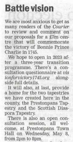 We're resolved at the Trust to make our locational decision by June 2020 and to proceed thereafter with our ambitious fund raising campaigns. There's a lot to be raised but we're optimistic. The Prince along with the Jacobites always arouses widespread interest as do our two brilliant tapestries - approaching 750,000 visitors since 2010. And as well as within our own communities we'll be working with VisitScotland and the national and international tourist trade to design a winning facility. It has to attract repeat visits from all within 50 miles radius and its ability to do that depends on offering an imaginative programme of events and activities that will warrant fee paying attendances.