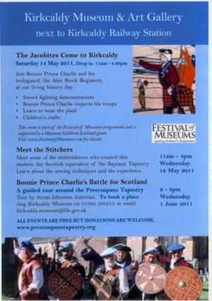 Kirkcaldy Exhibition Plans for the Prestonpans TapestryKirkcaldy's Museum & Art Gallery is proud to display the Prestonpans Tapestry - May/ early June 2011