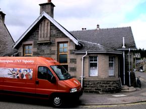 The village of Kingussie did not exist during The '45 - it was founded later that century - but the brooding presence of Ruthven Barracks reveals why it was important for us that the Tapestry visited the area. The car park beside the Iona Gallery provides a view across the railway to those mighty ruins, which of course feature in the Tapestry itself.