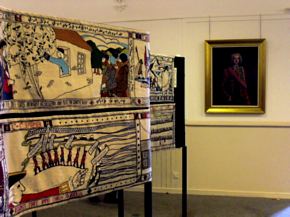 What better place to display the Tapestry than a community art gallery in the heart of the Highlands? The fit is a wee bit tight, but we have managed not only to get the whole Tapestry into the Gallery but also its now familiar supporters, the Trust's paintings of Andrew Hillhouse and Kate Hunter.