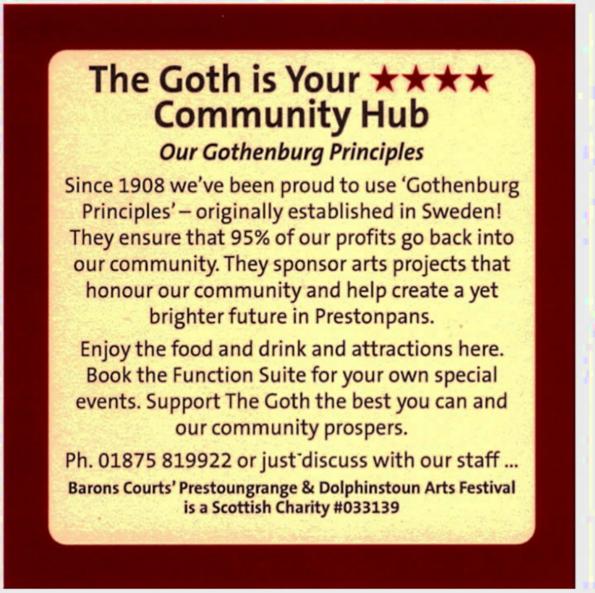 Sailors brought the Gothenburg Principles back to Scotland when 'prohibition talk' was abroad here at the end of the 19th century. And the same model was adopted not by communities as such but mine owners and philanthropists. This 'wise' alternative became the norm for 70 + pubs across the nation. Today only four seemingly still trade under their originating Gothenburg Principles - Armadale's Gothenburg, Newtongrange's Dean Tavern, Fallin's Gothenburg and our own Prestoungrange Gothenburgh [originally in 1908 The Forth Tavern]. N.B. Several others still have the name but not the Principles!