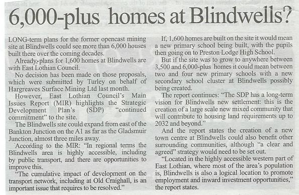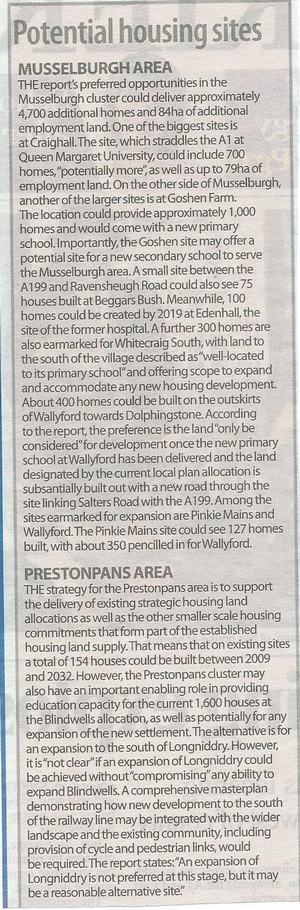 Prestonpans stands separately from Wallyford to the south west, Musselburgh to the west, Cockenzie/ Port Seton to the east, Tranent to the south and the new developments at Blindwells to the south east. Let's seek to ensure that it stays that way with green lands between us all. We have them currently but must speak up loudly to ensure they stay. Perhaps the greatest danger is to the south and west from new Prestonfields to Wallyford/ Dolphingstone but there is talk to the east of a total Blindwells of 6,000 homes one day in the future not just the present 1,600 or so.