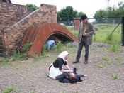 John Lindsay started the 'experience' reciting This is Prestongrange written on the occasion of the town's Twinning with Barga, and Brogan Fleming [pictured below] singing the Arled Bairn song plus a re-enactment of a pit accident at the mine shaft involving youngsters Bobbi and Deacon Ross. A visit to the Beam Engine followed - in which Davie Stott played the role of the much resented Overseer that later saw him consigned to the stocks by the Barons' Courts and pelted with rotten fish and vegetables by the indwellers.