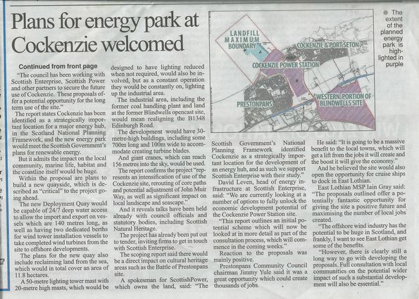 If Scottish Power are not going to build a new gas fired power station at Cockenzie, why not use the industrially zoned land, brownfield land, then released for the construction of wind mills with associated docking facilities. The story unfolds below.