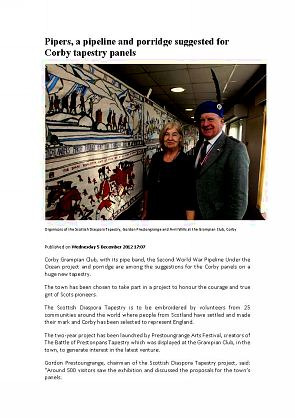 The Grampian is a hive of activity: on the first day of this November visits at the Club there was a fine carvery lunch, a children's disco and pipe band practice. Later in the week there's Scottish Dancing, the Burns Club and a Stitchers Group. For fine weather there are several bowling greens outside. They also sponsor Corby's local Radio on 108 so it was not difficult to create awareness of the project in hand - the Scottish Diaspora Tapestry itself! And the local Northamptonshire Telegraph gave our camapign front page precedence over the newly elected MP who replaced Louise Mensch last week.