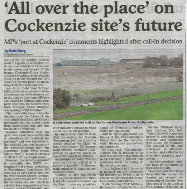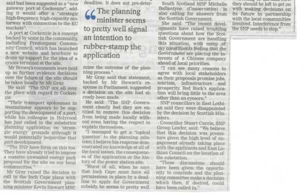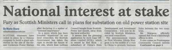The 'National Interest' issue at stake is clear. Where should the Chinese Inchcape OffShore/ OnShore SubStation be built? Should it be to the north or south of the shoreline road connecting Prestonpans to Cockenzie/ Port Seton? Both have readily straightforward connectivity to the National Grid. The Master Plan does not specify either. ELC are more than competent to have resolved the matter. In doing so it would certainly have listened sympathetically to the case from Prestonpans Community Council for a job creating Cruise Liner Terminal with potential for increased visitor numbers to East Lothian at large and not least the battle site, murals trail, Waggonway etc.