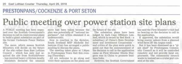 It is clearly true that Prestonpans Community Council and others feel that their proposal into the Master Plan process for a Cruise Liner Terminal at Cockenzie had not been carefully explored and indeed still should be, BUT .. there has never been any suggestion that Offshore Energy should not come ashore and enter the National Grid through the infrastructure asset already in place as a legacy from Cockenzie Power Station. The issue was where best to locate it in the future commercial industrial complex proposed in the Master Plan - Zones A, B or C. The only redline came from the 1745 Battle Trust who remain firmly opposed to it being placed on Zone D - much of which is the battle site.
