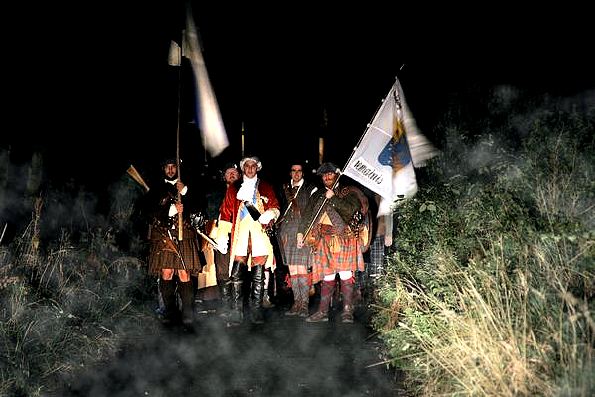 Each year since 2007 some 40/ 60 stalwart re-enactors and local walkers have gathered at Tranent Co-op car park at 4.30/ 4.45 AM. There they are fortified with hot soup, a Scotch egg and an apple for their silent walk in the dark to Seton Collegiate and southern Cockenzie ... where the initial skirmish took place. At 5AM, led by Colonel Adam Watters of the Alan Breck Regiment of Prestonpans Volunteers, the Walk begins ...