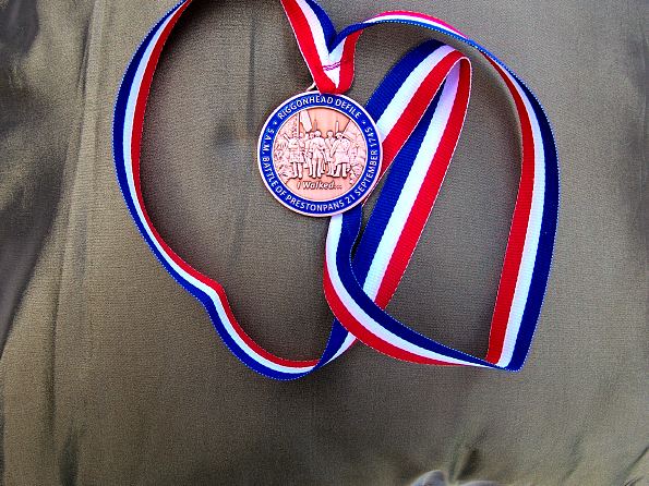 The Trust has always been extremely grateful to its legion of early risers, getting the Annual Re-enactment rolling each year. For 2012, the 6th Annual Walk, the Trust resolved to create a medal for all who join the Walk. But it does not wish to belittle the services of those who walked from 2007 till 2011 so they too are eligible for a retrospective medal. And so will Walkers be from 2013 and beyond. But there is to be a wee distinction. 2012 sees a red white and blue ribbon with their bronze medal whereas other years will be white and blue.
