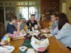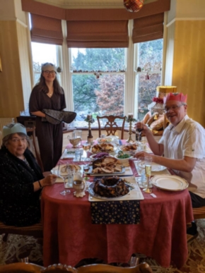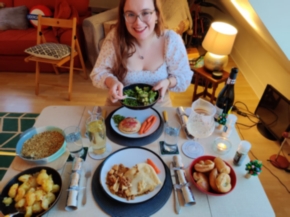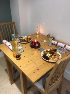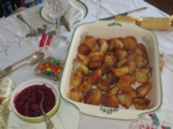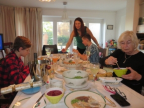 Natasha sets the pace with her Christmas dinner which surely Elliot there with her has prepared and dinner in The Lodge gets under way …. with roast potatoes partially prepared by SpudChef Henry and the table decoration by Avril that includes the fabulous Christmas roses flourishing in the garden that Gerry gave as a gift two years ago!