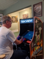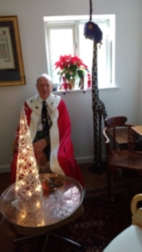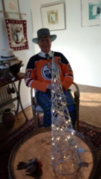 Mathew's got Brexit Done and can find time to play on his ARCADE present whilst Gordon poses both as Baronial Santa and Oiler Supporter in Avril's contrived Waiting Lounge in the hallway! The giraffe sports the baronial two feathers.