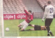 Let's get the misery over first. Despite Jamie Campbell's goal depicted below, which put Preston Athletic 1 up, on our first time of asking in the Tennent's Qualifying Cup [South] Final we did not, alas, come home with the Cup. Annan won 3 - 1 and are also are shown with their Manager Harry Carirney holding the elusive trophy aloft flanked quite properly with their goal scorers Michael Jack [2] and Ian Grainger.