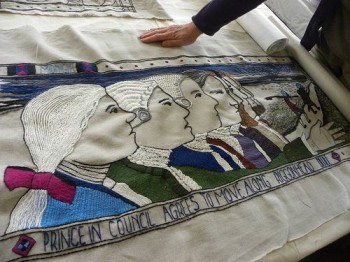 Panels # 30, 67 and 96 are now on the embroidered radar as these images were captured at June 10th. Blocking continues apace and on Monday June 14th Gillian Hart begins the photographic work to produce fine jpegs of the blocked panels both for the forthcoming book and for each stitcher to treasure for a lifetime and more!