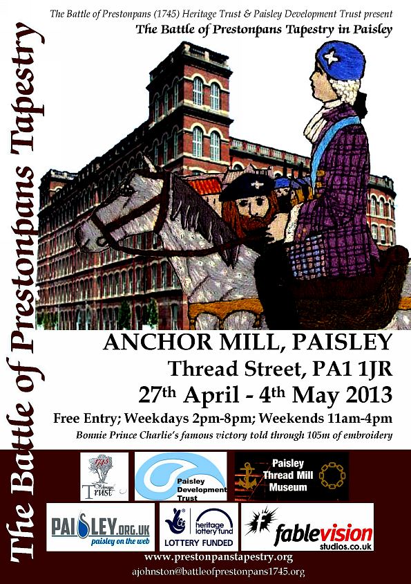Since the outset, the Battle Trust has been keen to find a location in Glasgow where the Prestonpans Tapestry can be displayed - but to no avail thus far! With the Paisley exhibition that opened on Friday night April 26th at Anchor Mill [not to be confused with the Thread Mill Museum's own location] we are coming pretty close. And it had to be a speedy move from Pinkie House that only closed on Wednesday evening - well executed thanks to Arran Johnston and the staff from the Museum. Friday night saw the great and the good including two more MSPs and many of the supporters of the Museum come along.