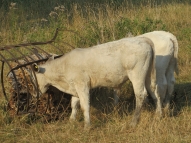 Happening outdoors as we bake in 35 degrees … Major newcomers, mistaken initially for 'sheep', are two white calves, mother close by. They seem fascinated by the bugs that must infest the 20 years ago fallen tree trunk. And at last some justice to the zinnias [left] and the very impressive yellow antirrhinum by the tomatoes in the front garden.