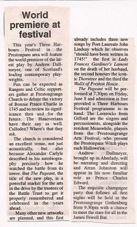 It is a Pageant of Song, Poetry and Theatre created by the distinguished Scottish playwright and actor, Andrew Dallmeyer, who was brought up near Aberlady, and who narrates and directs this premiere. The Laverock Singers and the Meanwhile Players are featured and new works by Laureate John Lindsay are included. But so are Rangers and Celtic supporters. It recounts the story of the famous Battle Victory in 1745 and debates its significance then and for us all today - most particularly the Hope and Ambition it inspires.