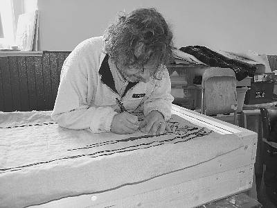 We used to call it tracing, and still do. Pat Fox, a member of the Prestoungrange Art Classes, created two new light boxes for Andrew Crummy's Studio and with many helpers to hand, each artwork is laid on the screen and the images Andrew has created are black outlined. Each Stitcher then receives the linen with the traced outline and the full coloured artwork to guide them.
