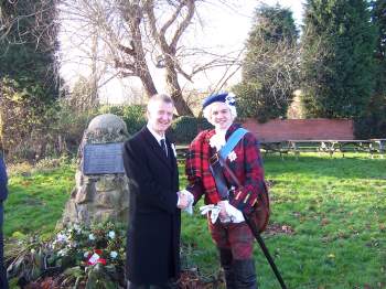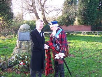 The annual re-enactment at the bridge continues its own factitious reality some 15 years since it was first conceived: the Highlanders are surprised by a redcoat force and withdraw, returning soon after to the swirl of pipes [the Drambuies again this year] to take all the redcoats prisoner - the Prince graciously accepts their surrender as shown below. Finally wreaths are laid at the cairn, one shown from the Prestonpans Heritage Trust by its Chairman, Gordon Baron of Prestoungrange [also shown], in gratitude for all the support Derby has given to the present campaign in Prestonpans for its Living History Centre.