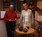 The 'final' Belfield Reproduction TeaSet, and its colouration, will not be unveiled until June 19th, but the test mould has already yielded its first excellent artefact that captures all the fine virtues of teatime in the first quarter of the last century. It is the teapot itself, and it is is pictured below on the table before Tony Carter and Lady Prestoungrange at Tony's unique tea pot factory in Debenham, Suffolk.