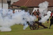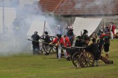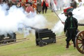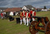 The artillery the Camerons faced in the re-enactment, six 1.5 pounder cannons, was provided by Lancashire Militia [4], Birkbeck's Battery [1] and Glenbucket's Highland Regiment [1]. It was the first occasion since 1995 that full artillery action has been 'authentically' portrayed and it is to hoped that it can become a regular feature for the years ahead. The pyrotechics which certainly spiced up the artillery salvoes came from the Militia.