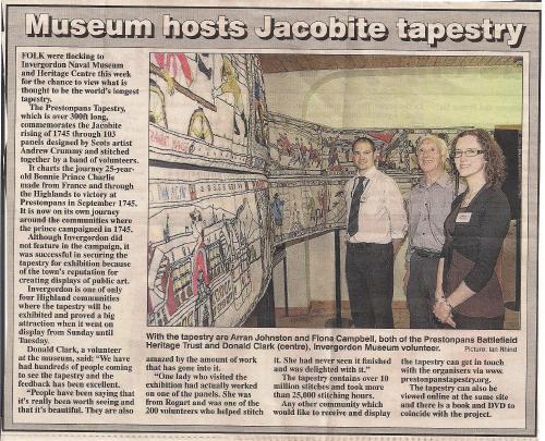 There was never any doubt that our 'sister' Scottish Murals Town, Invergordon, would give the Prestonpans Tapestry a warm welcome during its 3 day brief visit there August 8th/ 10th. And true to form just short of 350 visitors came to the town's important Naval Heritage Museum to see it as Arran Johnston and Fiona Campbell continued the Trust's Parade through the Highlands.