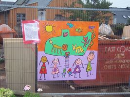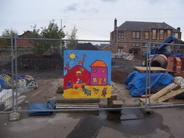 Using designs from children in the town they have created boards to hang on the wire fencing surrounding the Town's 'Carnegie' Library on Ayres Wynd which is currently being renovated and extended. Their work was 'unveiled' by Provost Pat O'Brien as reported here and is shown in full glory below. Certainly cheers up an otherwise dreary view.