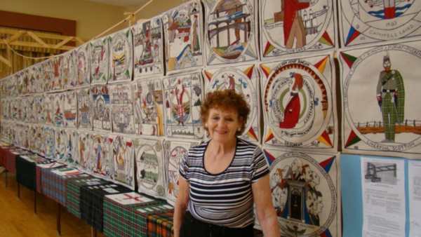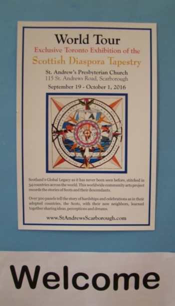 This exhibition in Toronto, at St Andrew's Scarborough, is unique in the way it has been presented. Only once before, at Stirling University in 2014, has the Wall of Colour been so magnificently displayed. And be assured, the stories that go with each panel are not separated; the QR tags enable the APP to tell each tale in English, French and Gaelic. And it can be well imagined just what a labour of love it has been to create the Menai Straits wooden frame to hold that Wall of Colour so magnificently. [Jenny Bruce, Tour Director, stands in front of the artwork as it gets ready to formally open the doors - next to No.10 Downing Street panel stitched by Gillian Lindsay of Scottish Prime Ministers of the UK. Is she pondering the exhibition to come in Westminster Hall, London, next March/ April?]
