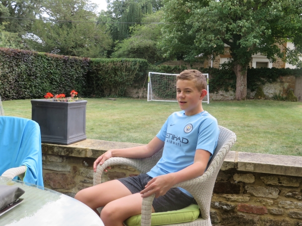 Bets and windfalls. Henry was in the spirit of Sunday afternoon tea at the Big House - even though he had a poorly neck from the 'noisy neighbours' swimming pool escapades on Saturday. He placed a bet of £1 each way that I couldn't walk unaided by sticks from the Barn Patio to the goal's cross bar at the Old Rectory End, touch it with sticks, and manage the return. I won the bet, he played me back with countdown theme … and duly paid up. Next his footballer's chance to win it back .. hit the crossbar from the Barn Patio end within 10 shots; he made it in 4 the ball skimming onwards and over the wall into Rectory Lane. He attributes his talent to the Manchester City kit he wears as pictured … Honour and quits then.