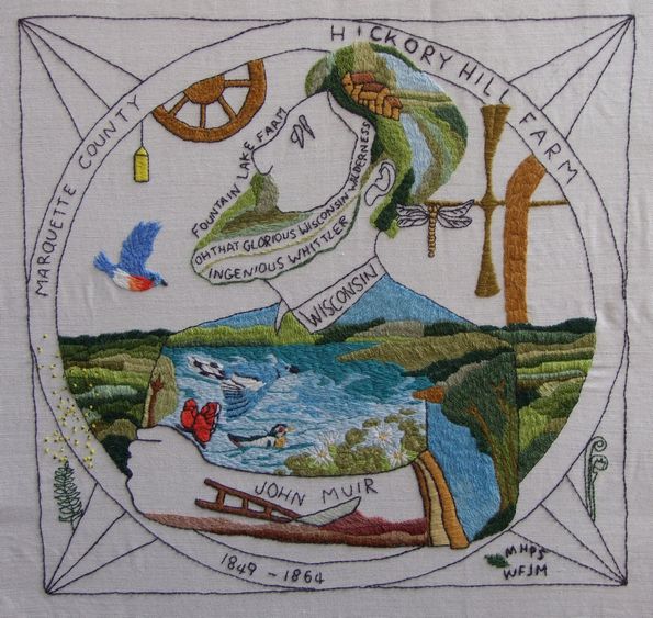 His later youth was in Marquette County Wisconsin USA where the second panel, shown below, has been stitched by Kathleen McGwin and many friends there of their John Muir Historical Trust.