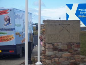 Someone had to see the BattleBus safely to The Pans so that Kris Cunningham and Battlefield archaeologist Dr Tony Pollard could pose above by the open door. That role fell to The Baron and Lady Prestoungrange seen crossing the Border below; and en route Mathew Prestoungrange Younger and Lorna, The Maid of Prestoungrange, both played their part.