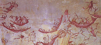 The cave, when discovered, also contained 'death ships' which are now in the National Museum. They are rendered in red hematite and cover a narrow strip stretching for some 30 metres. They portray spread-eagled human figures probably representing hunters and warriors, some of the animals from the surrounding forests and, most significantly, longboats carrying the souls of the deceased on their dangerous journey to the land of the dead.
