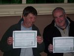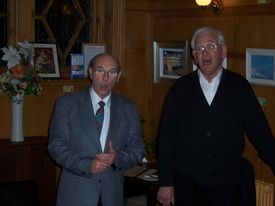 The volunteer singers who shared the evening session at The Prestoungrange Gothenburg added much pleasure and were [left to right below] Bob Leslie & James Christie of South Side Singers + Susan Taylor & Stuart Davie of Vocal Chords. [The final photograph on the page shows the Poet Laureate indeed relaxing as the total passed 100!]