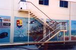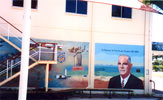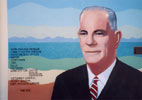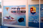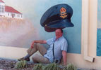 The first describes the story of the town's port and has Australia's 2001 Centennial stamp of approval. Helen Hansen and Lady Avril stand in front. The second was inspired by a teacher at the local school who fronted up to the visiting Premier of the State with a proposal that one of the town's most distinguished sons should be recognised - not least as a prime mover 40 years ago in the school's establishment. Sir Peter Delamothe rose from town doctor to Member of the Queensland Parliament, into the Cabinet and finally to London as Agent General for Queensland on the Strand. During the 2nd World War he served with the RAAF hence his cap in the mural beneath which Prestoungrange (some time Flying Officer RAF) perched himself for his camera call.