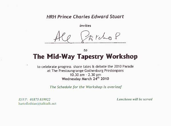 P.S. If there are any amongst us who write and perform vaudeville and would care to have a 'shot' at our own Prestonpans Tapestry, please be in touch - La Tapisserie du Beau Prince Charles, peut etre? Then we can take it to The Fringe in August 2011 .....