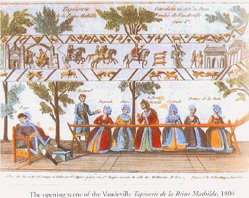 Those who've been following the website carefully will recall it's the programme cover from the 1804 vaudeville theatre show in Paris 'La Tapisserie de la Reine Mathilde' [aka The Bayeux Tapesty]. Napoleon brought the Bayeux Tapestry to Paris to strengthen his dynasty after he declared himself Emperor in 1804, and the Parisian theatre could not resist its vaudeville show. It's also the opening scene with the ladies hard at work stitching ... and the Bishop of Odo [aka Andrew Crummy] resting in his chair!