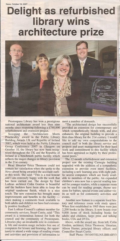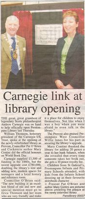 More than 100 years ago the famed son of Scotland, Andrew Carnegie, donated £1500 to build the town's local library - one of the incredible tally of 3000+ across the world. On World Book Day, March 1st 2007, his great great grandson William Thompson was on hand to share in the opening ceremony for an elegant new extension - which nominally cost over 500 times as much to construct. Details of the additional services that can now be provided are given by Erica Thompson, the Town's Librarian, in the press cuttings below.