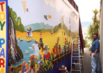 But the big new mural story is almost finished too. Its another one for the children (and the young at heart). Kati Kati has already pioneered paintings with and for children which we have emulated at Prestoungrange of course. The new work is called Toy Parade and depicts toys across the generations and cultures that have come to Kati Kati. It is brilliantly located on a cut through alley to off street parking. Hans again figures in the scene.