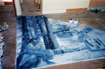 And Kate Hunter, who has already completed two major murals for the Arts Festival, is hard at work in the Forth Lounge upstairs facing north on her third. Shown below is her line drawing, the work as it emerges on the boards and the wall at the Conn's home opposite The Gothenburg where it will hang and be unveiled on July 23rd. Maggie Conn's daughter is assisting Kate in the work.